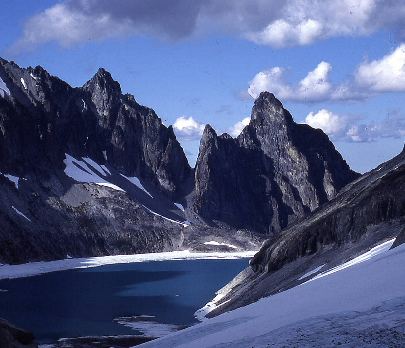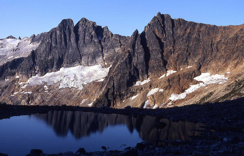 Finally, Silas Wild, Jim Lucke, and I made it to the top in 1981, coming up Ross Lake on the water taxi, and running the ridge north of Silver Creek, climbing Devils Tongue, then retreating a bit and dropping left beneath the cliffs of Devils Tongue to Silver Lake. Our route from the lake was fairly intuitive. Go up to the notch, then take the path of least resistance, a rightward slant up that west face. Three pitches, the first two easy 5, then a final class 4 pitch.