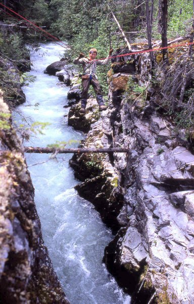 Ted Hegg on a Tyrolean traverse across Thunder Creek