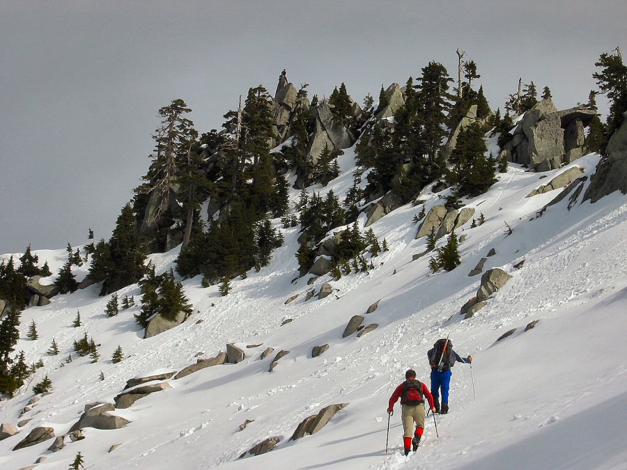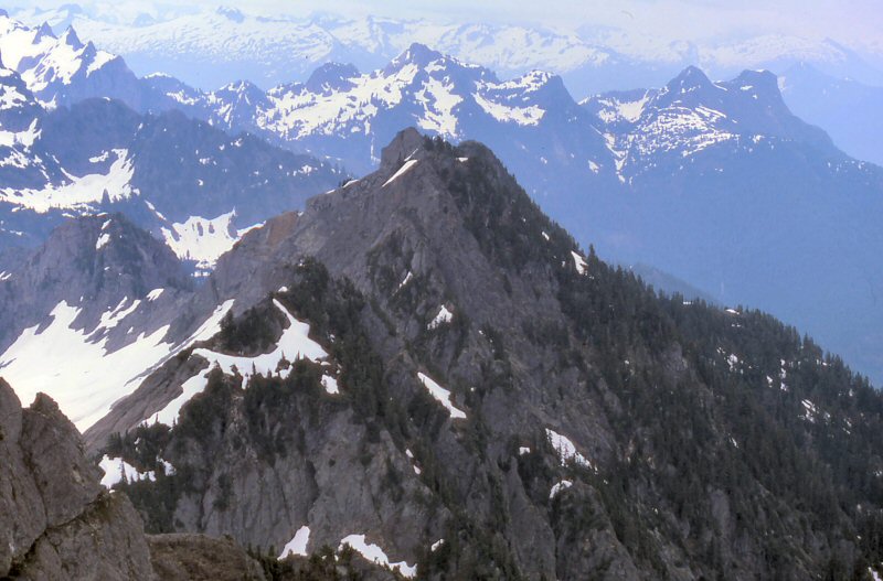 Short story: Turn off HW 2 just east of Sultan following the Sultan Basin Road to Olney Pass. Here, a gated road just right of the main drag can be biked for 5 miles to the Middle Fork of S Fk Sultan River (bridge out), just below Kromona Mine. Either take the “trail” remnants to the significant mine relics, climbing over Prospect Peak to a 4400- saddle just SE, or reach this saddle directly from Middle Fork. Descend 300' then do a gradual ascending traverse over snow or boulder fields to the 5110-pinnacled top. A 20-foot class 4-bouldering exercise via a wide crack up sticky rock completes the climb from the south.