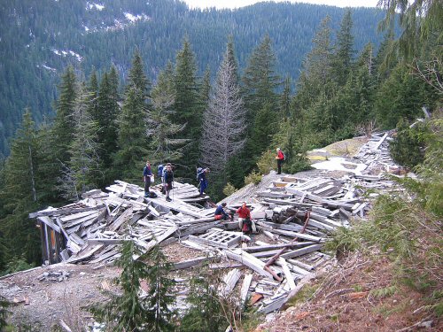 The mine was high above the road and we rode the buckets on a big steel rope up to the portal. The mine was mechanized with modern equipment and there was a 100-ton concentrating mill below in full operation. Two huge diesel generators powered all the equipment and the concentrates were contained in an enormous tank-like silo and were shipped periodically to the Tacoma smelter. As you said, there were a lot of minerals there (gold, silver, copper, zinc, molybdenum of course, and I don't know what else). Joe [Kromona] could never get enough investors to pay to have the mine fully blocked out (extensive core drilling to determine the total amount of available ore), so the mine was finally closed for good and scrapped out. Our visit was around 1960. At the time I was 33 years old, married with three children and hadn't discovered the joys of mountaineering (did that in 1962). I would guess Joe's age then at 65-70 years. I wonder what Jon Zak observed when he went there. I think I'll ask him.