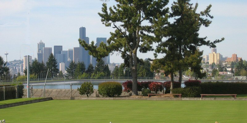 Mike Urban was into the whole honest-highest-summit thing enough that he wanted to check out the eminence near the clubhouse, so we crossed over to near the lawn bowling green where there is quite a nice view across the Beacon Hill Reservoir to downtown Seattle (above).