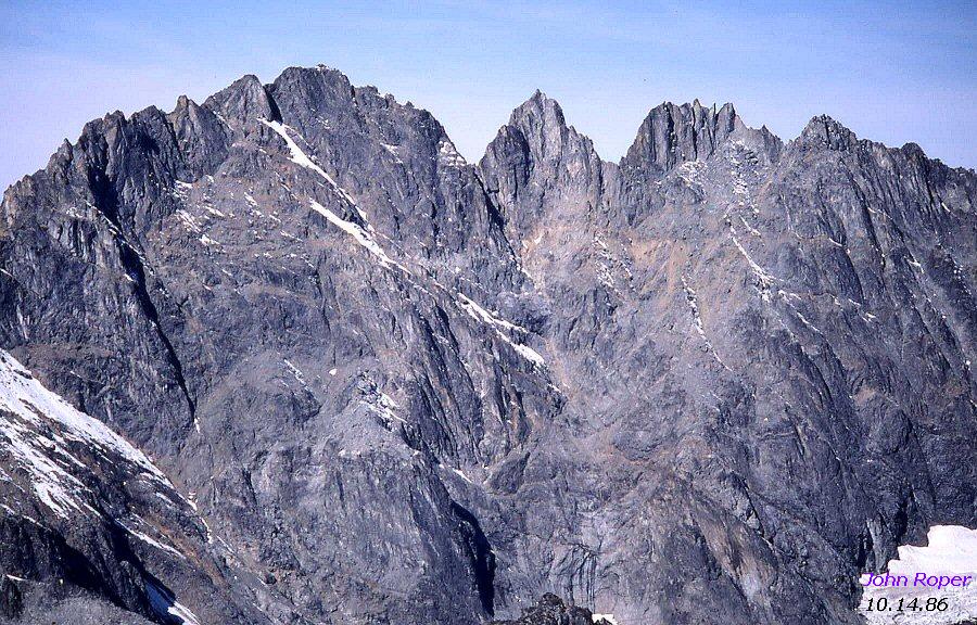 SW side, with Colfax Peak upper right. On June 25, 1989, Reed Tindall, Silas Wild, Dick Kegel, and I came up from the lower right (1), into the "X Couloir" (2), then up the faint snow arete (3), angling to the "Leaning Tower of Pisa" (4), then to the high left notch at first sky (5) where we worked our way right to the top. We descended straight down the gully below the summit (6) to our tracks at the tower. This is one of only two aerial shots from my camera in this collection. All the rest of my photos were taken from the ground, although telephotos sometimes give an aerial feel.