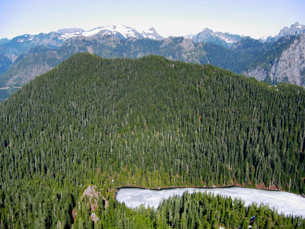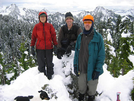 The initial couple hundred yards above the lake were a bit brushy with snow-draped huckleberry soaking arms and legs. Then as the forest opened up, a bit of sun did come out, which was not to our advantage as it warmed the snow-laden boughs overhead making the rest of the trip to the top seem like we were in a cluster-bomb raid, as snow clumps plummeted from the sky crashing to the ground all around us. Luckily Sofy and I took only one glancing hit.