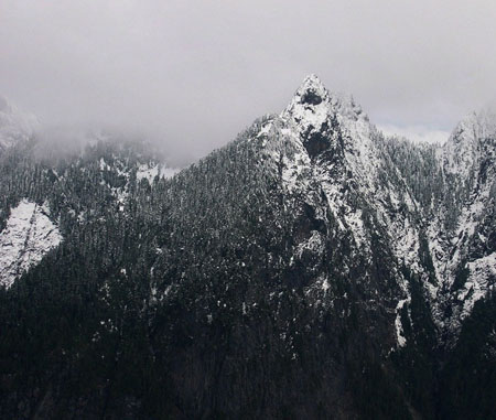This unheralded summit lies about 5 miles ESE of the upper end of Spada Lake in the highly-ignored Sultan River drainage. Paul Klenke raised this landform to the level of my consciousness on January 11, 2005 when he sent me (and Jeff Howbert ) an email noting that he had discovered a map anomaly as he was reviewing the peaks and contours on the USGS Mount Stickney quad. Take a look at this map link, and then take a closer look at the contours on the peak marked with the crosshair, just north of Boulder Lake . On first glance there appear to be two 4640+ summits on this ridge, this one marked, and one just NW.