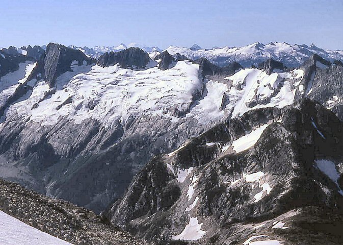 Perdition Peak on left, then In Spirit Peak, Cervical Peak, The Osteophyte, Thoracic Peak, Lumbar Peak, The Herniated Disc, and The Sacrum. The Coccyx is just off the photo to the right. Wilcox Lakes lie just below the photo. Taken from camp on climb of The Haystack' May 9, 1976.