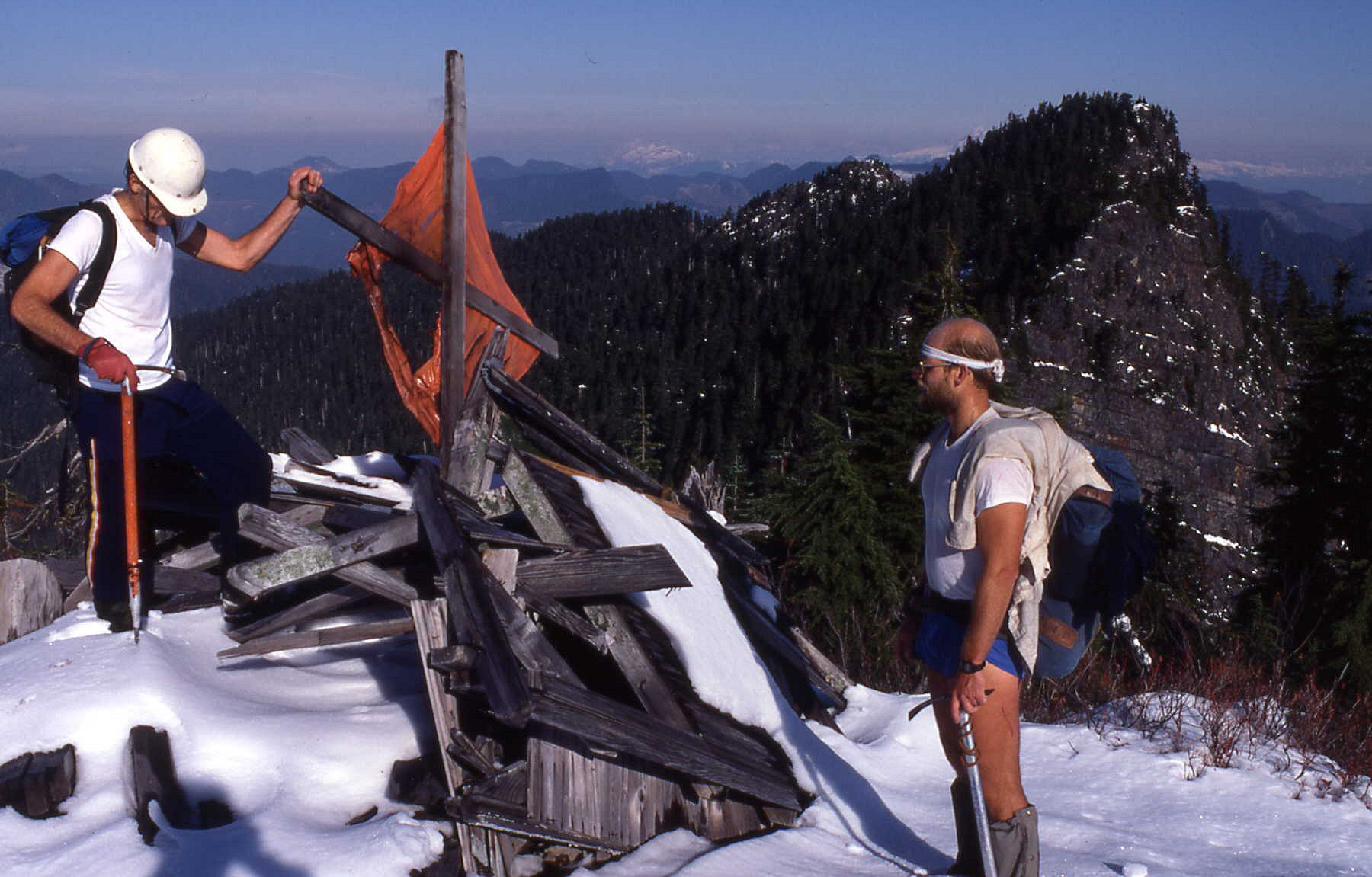On October 24,1984, before I knew of the Skadulgwas story, she stunned me. Climbing Mount Higgins from the west via "the long way," Dick Kegel, Bob Tillotson and I ran into snow so low that we abandoned the trail before Myrtle Lake and went straight up the west ridge to the 4849-foot Higgins Lookout summit. Only a tilted piece of the roof of the cabin that was manned from 1926 to 1949 remained.