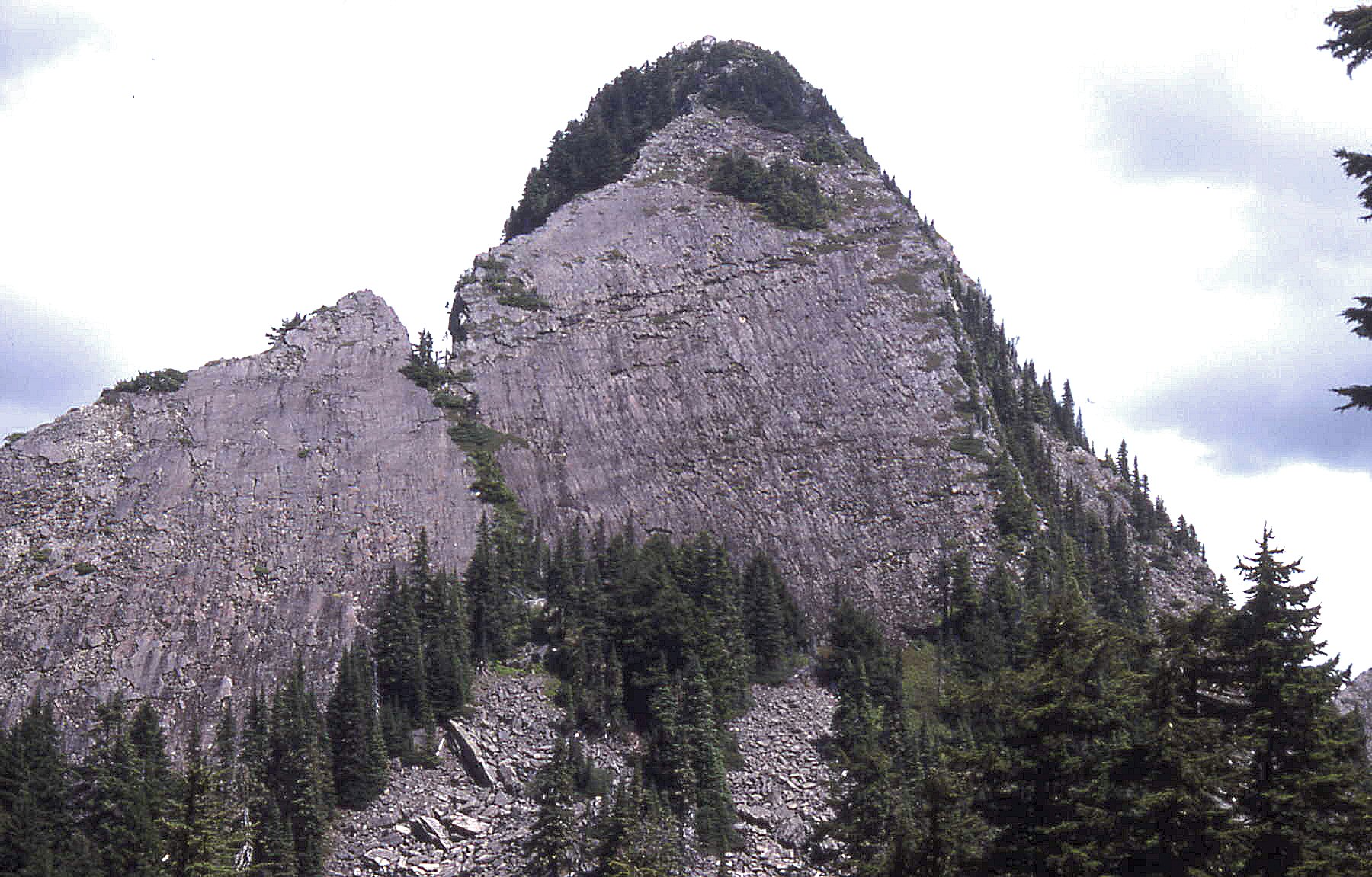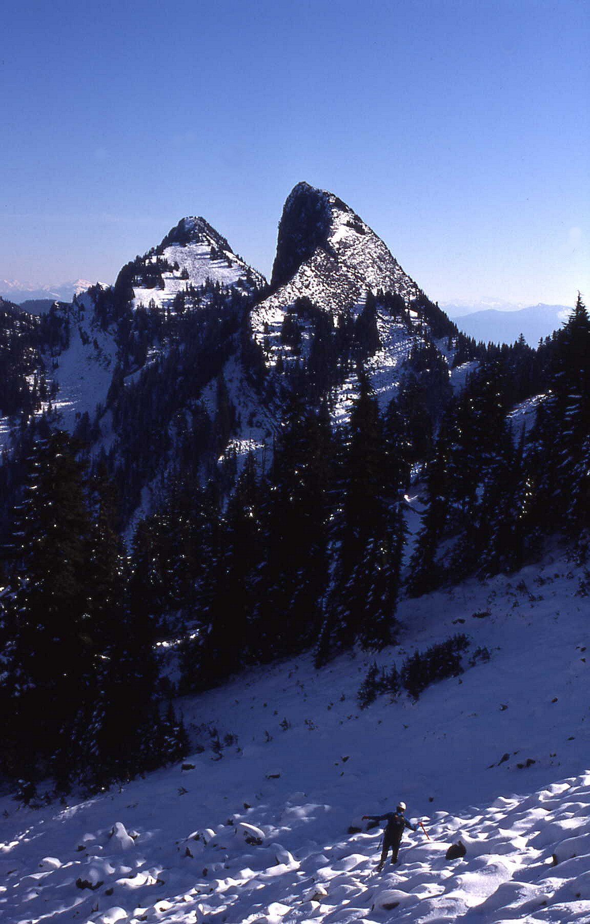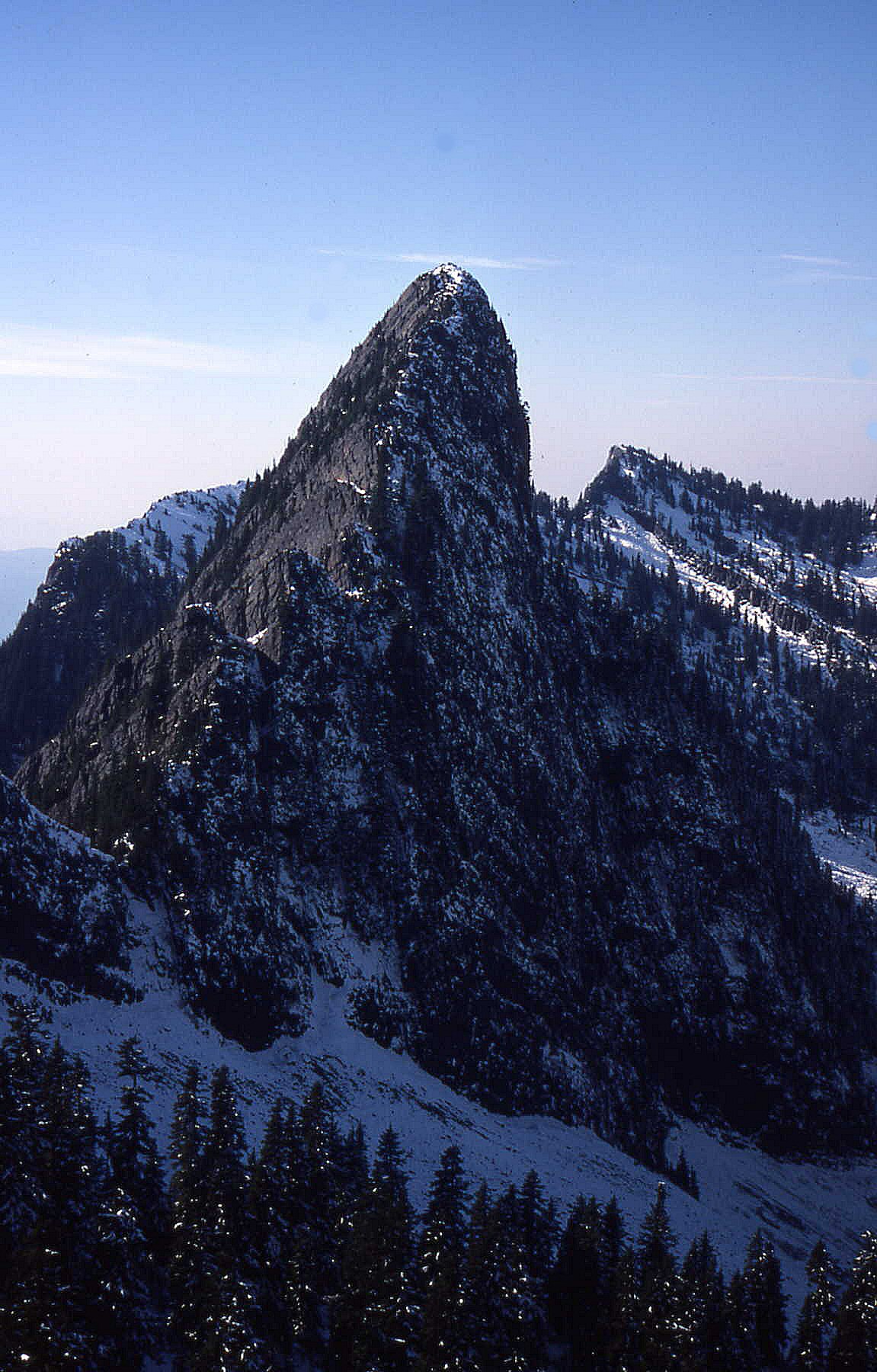 From the lookout, we continued east, but were forced to lose 1200 feet to bypass the vertical north wall of the then-unnamed middle peak of Higgins. As we worked our way around it, this peak (now "Skadulgwas Peak") made our jaws drop.