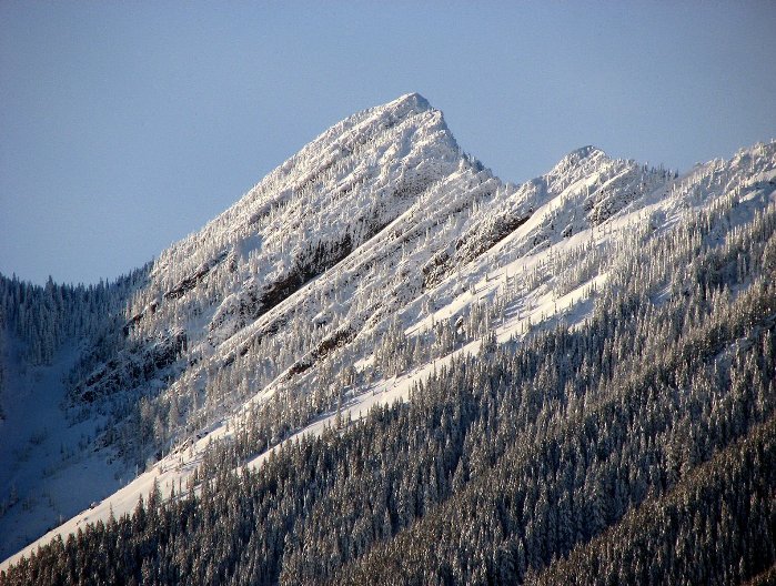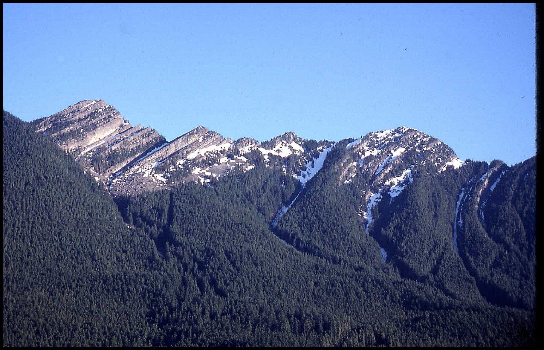 Queest Alb is Three Fingers Mountain. Sobahli-ahli is Whitehorse Mountain. And to this very day as you drive the valley between Arlington and Darrington, you can still see to the north where Sobahli-ahli's fingernails dug deep scratches in Skuldulgwas (Mount Higgins, Middle Peak) during the fight, gouging out scars for eternity. Look for them.