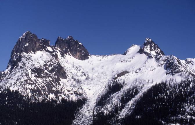 Liberty Bell left, SEWS right, HW 20 in Early Winters Creek from Cornice Peak summit. JR 5.15.04