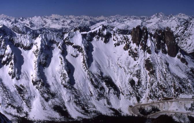View from east (Big Kangaroo). HW 20 Hairpin lower right. Spiral Gulch to Cornice Peak is above Hairpin. Liberty Bell and EWS directly above road. Washington Pass at right edge. Four other bowls off the hairpin beckon spring skiers. John Roper 4.30.89