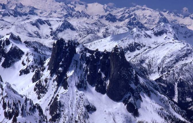 Cornice Peak left, EWS-Liberty Bell group center, Washington Pass lower right. Viewed from Silver Star.