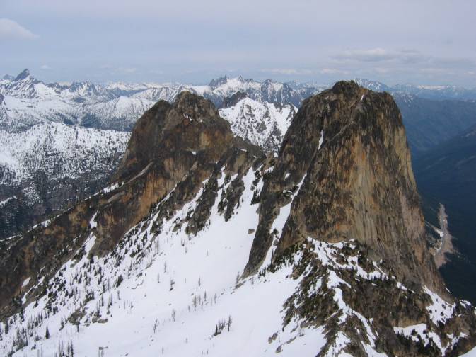 The photo below from the Cutthroat (west) side shows the entire approach up the snow gut to various climbs and skis on this flank, with Cornice Peak on the right, Early Winters Spires left-center, and Liberty Bell left. The Blue Lake route is off the photo to the right.