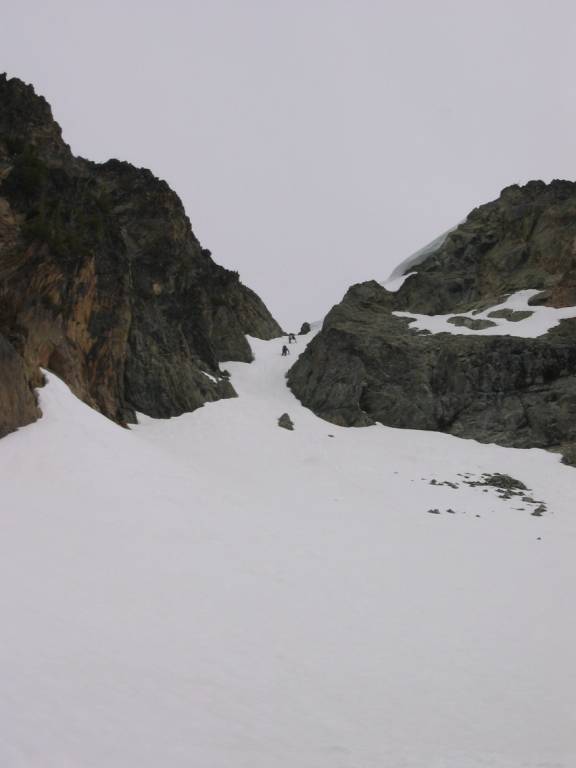 After photos around, unfortunately muted by an approaching storm, we headed south down the ridge above Copper Creek to the first saddle that dropped right into Blue Lake. Here a short gully leading into the broad basin above the lake was negotiated, first plunge stepping, then facing in as the snow got stiff, finishing with seat glissades after the steepish section.