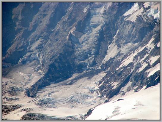 Zoom shot to lower Liberty Ridge and Thumb Rock above Carbon Glacier