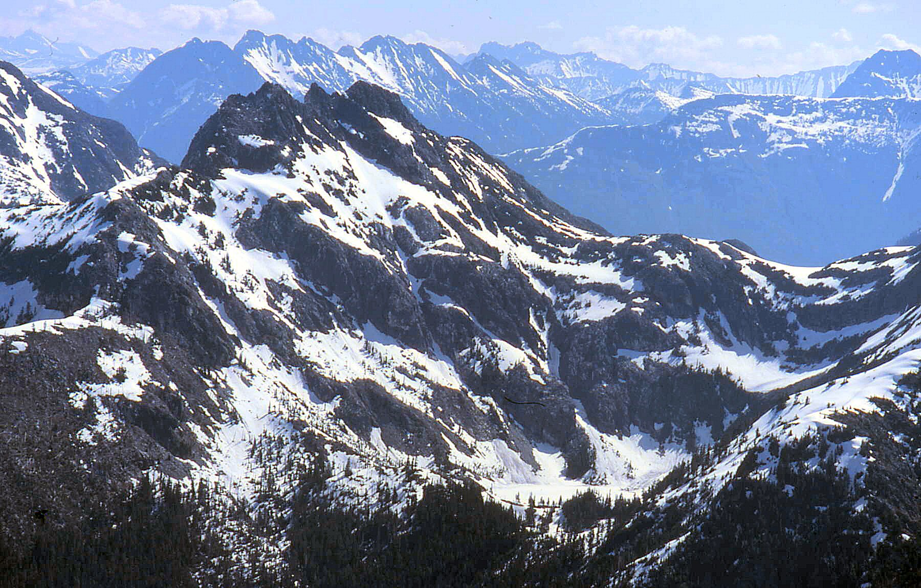 right center. The Coccyx on left, T-Bone Ridge right, Wilcox Lakes' lower left. From Isolation Peak.