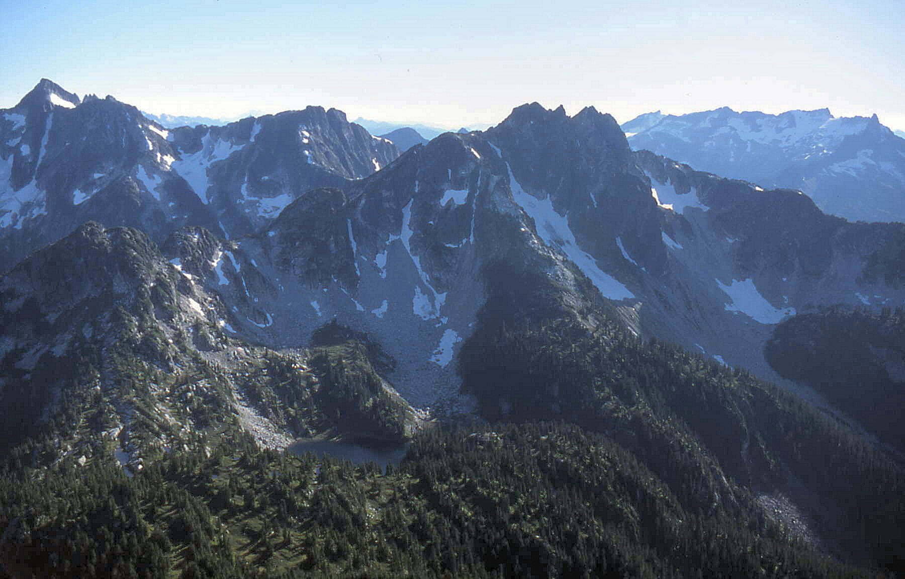 above Stout Lake, Elijah Ridge on skyline above. The right summit is highest.