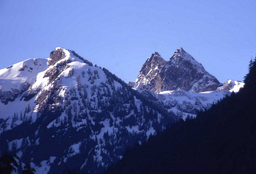 the twin spires on right, from Newhalem. Little Newhalem Peak on left.