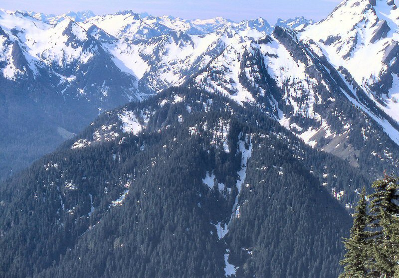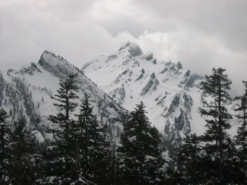 The route was pretty straightforward from Barlow Pass: WSW through open timber with some big Dougs and hemlocks to a bench at 3400 feet, then NW to a 4120+ intervening spur, which was then followed clockwise to the 4513' top. No problems. We hit snow at about 3200' and put on snowshoes at 3600'. The top had miserly views to Twin Peaks, Sperry, and Morning Star, but on the way up the SE ridge there were some nice open windows over to Sheep, and up the headwaters of the Sauk to Wilmans and Columbia, Silvertip and National, and south to Lewis and the stunning Del Campo which made it all worthwhile.
