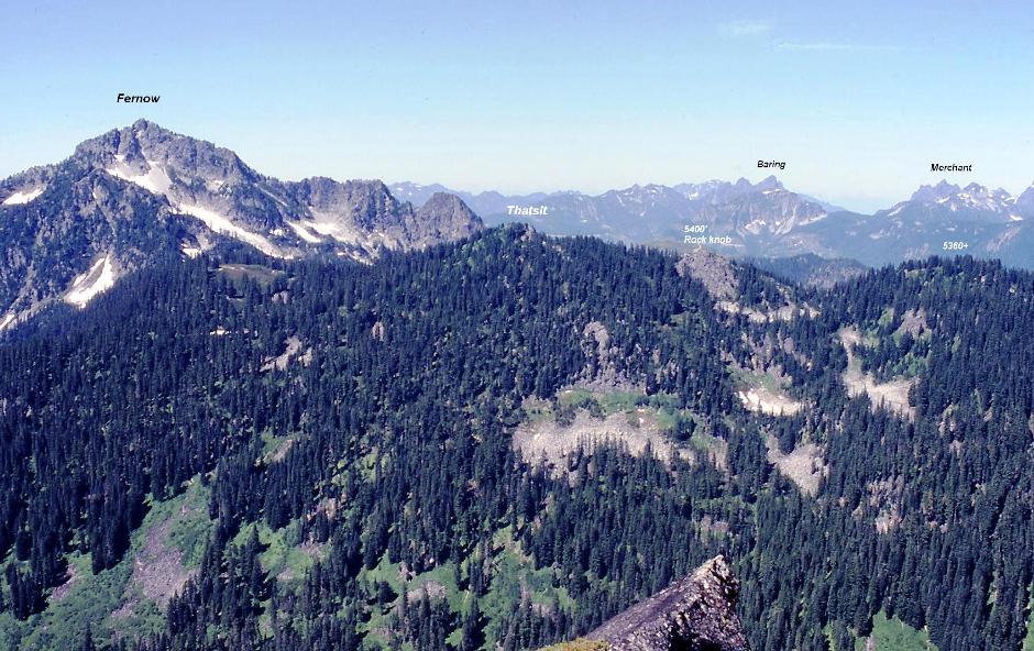 Why is this peak such a sleeper? After our trip, I went back to look at slides I'd taken in its direction from the named peaks that encircle it—Fernow, Sunrise , Scorpion, and Captain Point. It's there, but it's barely noticeable, as Fernow so completely dominates the scene. Jeff Howbert was first to note the significance of this hidden treasure in the Bellevue Library a decade ago, as he poured over maps looking for peaks with 400-feet plus of prominence. Its first ascent was probably on October 15, 2001, when Steve Fox was scouting out abandoned trails around Captain Point with Jeff's info in hand. Our group thanks Fay Pullen who maybe did the second ascent of this peak just 4 days before our trip. She did it as a ski trip, making more use of logging roads into the Mount Fernow Pothole valley, and finished on the SW ridge. We crossed her ski tracks several times.