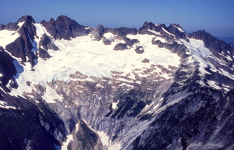 In 1981, Gary Mellom and I hiked over Green Mountain and sidehilled across cursedly slippery hellebore above Downey Creek, eventually to Misch's east flank, its prettiest side, shown in the photo above. During a lunch break at the edge of the Goat Creek Glacier, we heard a thunderous crashing noise above us and looked up to see chunks of ice as large as washing machines breaking loose from the NE wall of Misch, directly above us. We ran for our lives, leaving our packs behind to be partially buried in the snowy spray, as the bounding ice blocks left thought-provoking divots in the snow all around our resting spot. With pounding hearts, we grabbed our gear and quickly moved on, scratching our plan for a new route up this glacier to Misch this day.