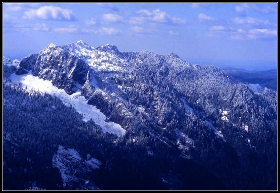 --This summit gained some notoriety a few years ago when a weird TV series bearing the “Twin Peaks” name was shot in part in Snoqualmie and North Bend. After we went looking for the "Log Lady," even Mike, "the Torch" (crowned for his frequent after-dark, flashlight returns) admitted this was a "real hard trip"--4700' vertical brush and 12 miles on our last winter climb in 1996.
