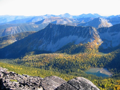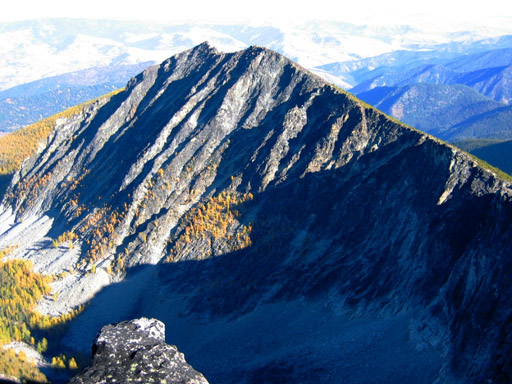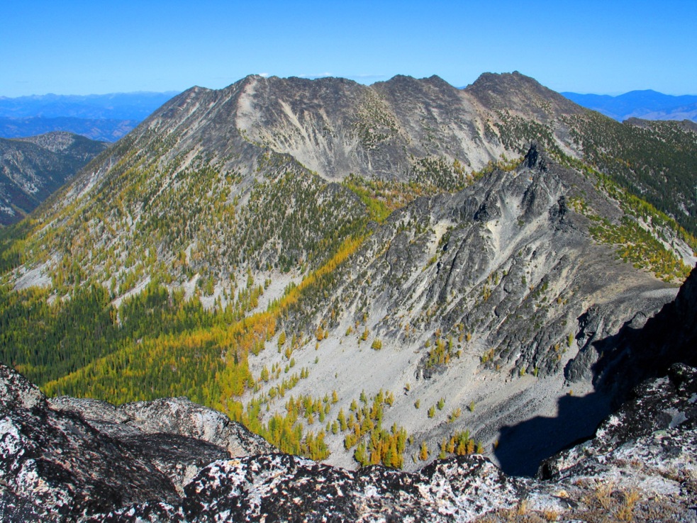 1. We did this summit because of a controversy that this 8572-foot point on Raven Ridge may be higher than the 8580-foot summit 0.6 miles west of here on the map. The 8580 top (“Libby Peak”) is on the Bulger List of Top 100 peaks in Washington and is the summit all the Bulgers have climbed on their way to claiming this prize. Silas and I went over it twice (on our way to and from Hoodoo) in 1985 and 20 years ago thought that the 8572' east point of Raven Ridge may have been higher as we looked back at this ridge from Hoodoo. Certainly 8572 is a better looking point than 8580. Don Duncan and Roy McMurtrey did a survey with a 6-inch long transit on 8/19/2000 and concluded that 8572 was 17 feet higher than 8580 (which seems a little excessive to the eyeball, as this photo from the south suggests).