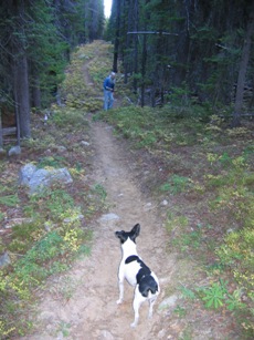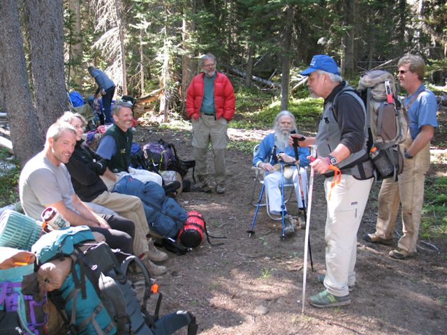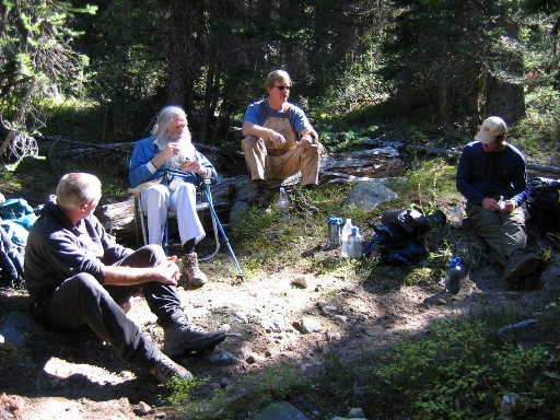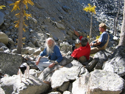 While we packed up, Austin and company kept hiking. Although 83-year old Austin worried about how he'd do, thinking it might take him two days to do the 6 miles, 2200-foot gain to the “glacier,” he surprised even himself. It wasn't until past the E Fk crossing that we caught up with him. Here he pointed out that the trail followed a clearing for a never-built road that extended all the way to due west of Hoodoo Peak .