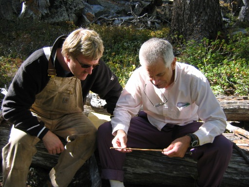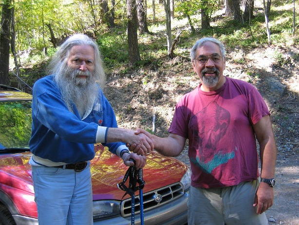 But in the middle of September 2004, a wintery early-fall storm blew onshore and put that plan on hold. The fire was rekindled in August 2005, and roared into action on Saturday morning, September 24, 2005. Eleven of us coming from different directions in several vehicles gathered at the East Fort Buttermilk Creek, up the Twisp River, south to Twisp town. Austin and his son and nephew, as well as John S. and Jim L, and Bob and Shelley had come up the day before to get an early start, and Jim N was up working on his Winthrop cabin. I picked up Silas at Ash Way, and we loaded Jerry in Rockport, and enjoyed a perfect day over the pass and on into the Twisp bakery for a “Cinnamon Twisp” (we went for the day-old, two for the price of one, still great).