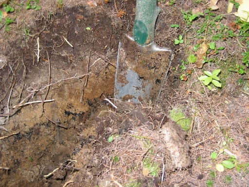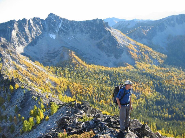 Then Austin directed me on a task that trumped all the other data-dating collections. I pulled out my garden shovel and dug into the earth at a little sink in the ground. Under the top layer of larch needles was a layer of darker organic humus, and next down was an approximately one-inch-thick layer of gray matter that Austin delightedly announced was probably Glacier Peak tephra (Greek for ash) from an eruption that occurred over 10,000 years ago. So this moraine we were standing on was at least that old, if this sample does indeed prove to be Glacier Peak ash.