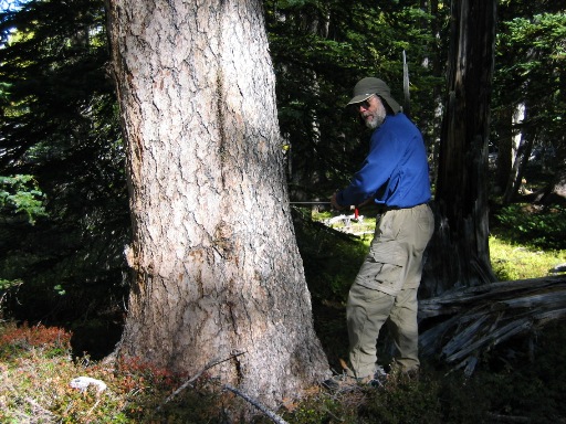 Jim and Sofy and I left the group at about 1PM, and headed off for Raven Ridge, passing this dried-up pond which we'd originally thought could be a water source for a camp here. Shortly after the pond was running water, and we soon heard the hoot of John S. and Jim L. and could see them on the top of Mount Bigelow. They had been sent there by Austin on a mission to collect samples of trees that Austin found here in 1947 which were higher than all the other trees, and bigger. John found a tree that met this description and counted about 270-years worth of rings. Incidentally, it was Austin who named Mount Bigelow, after his likable Forest Service trail boss, Frank Bigelow, as he, his son Bill, and Austin built the trail along the Chelan Crest in the 1947 with a small bulldozer with a 27-inch blade that they called the "Trail Beetle."
