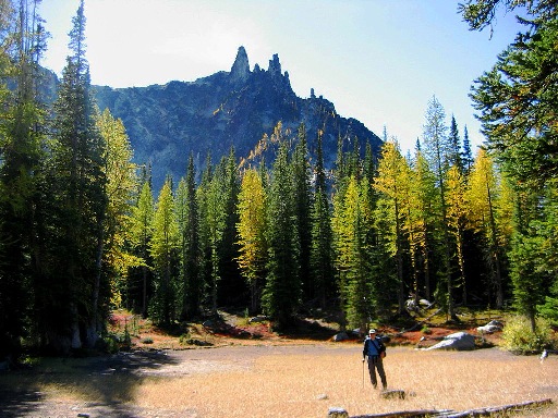 Everyone gathered again at the next creek crossing at 6300 feet, at an old campsite. We continued on to the double switchback on the map where the bushwhack to the glacier would begin. Jerry offered to run ahead and check out the water and camping situation at the hoped-for “glacier” while several of us used this break to check out Hoodoo Pass which I've wanted to visit ever since spotting it from the top of Martin Peak, 20 years ago. It was plenty nice, but not quite as spectacular as I'd remembered, but it gave great vistas to “Cheops,” Martin, Old Maid, and back to Oval, “Beefhide Butte,” and “Séance,” at the end of Spirit Ridge.