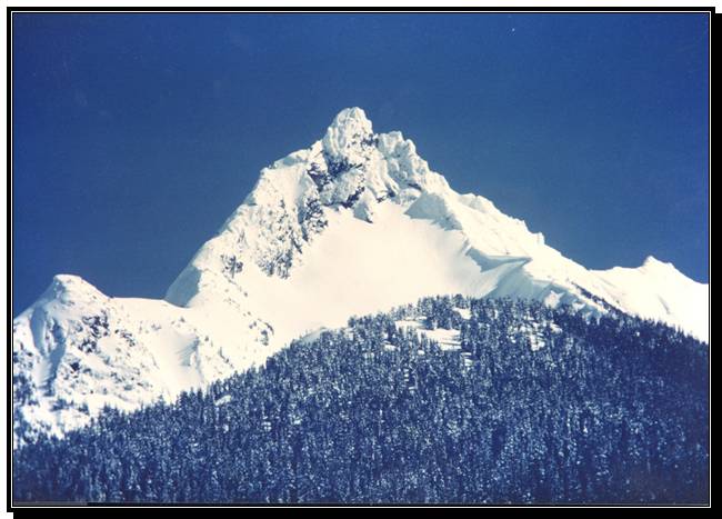 Following the obvious west ridge of Nachaktsen, logged to 3100 feet 50 years ago, then up through that usual dreary old-growth stuff, we hit snow at about 4200'. Ducking around the south side of the rocky summit-tuft of Nachaktsen, we finished the last 200' vertical from the east over class 3 rock and ledges. The summit was uncairned.