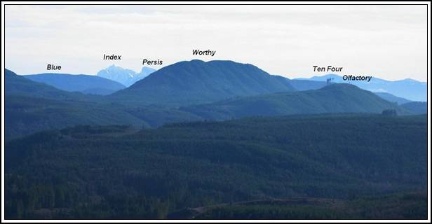 Our efforts were finally rewarded with views south to the Columbia Center skyscraper in Seattle, our home on Somerset hill, Squak, Tiger, Ten Four, and a straight shot across to many of the “Stilly Hills,” Granite Falls, and the miniature range of humps surrounding it, including the forbidden Iron Mountain and some bikable beauties (“Worthy Hill,” “Olfactory Hill,” “Flat Tire Hill,” etc.).