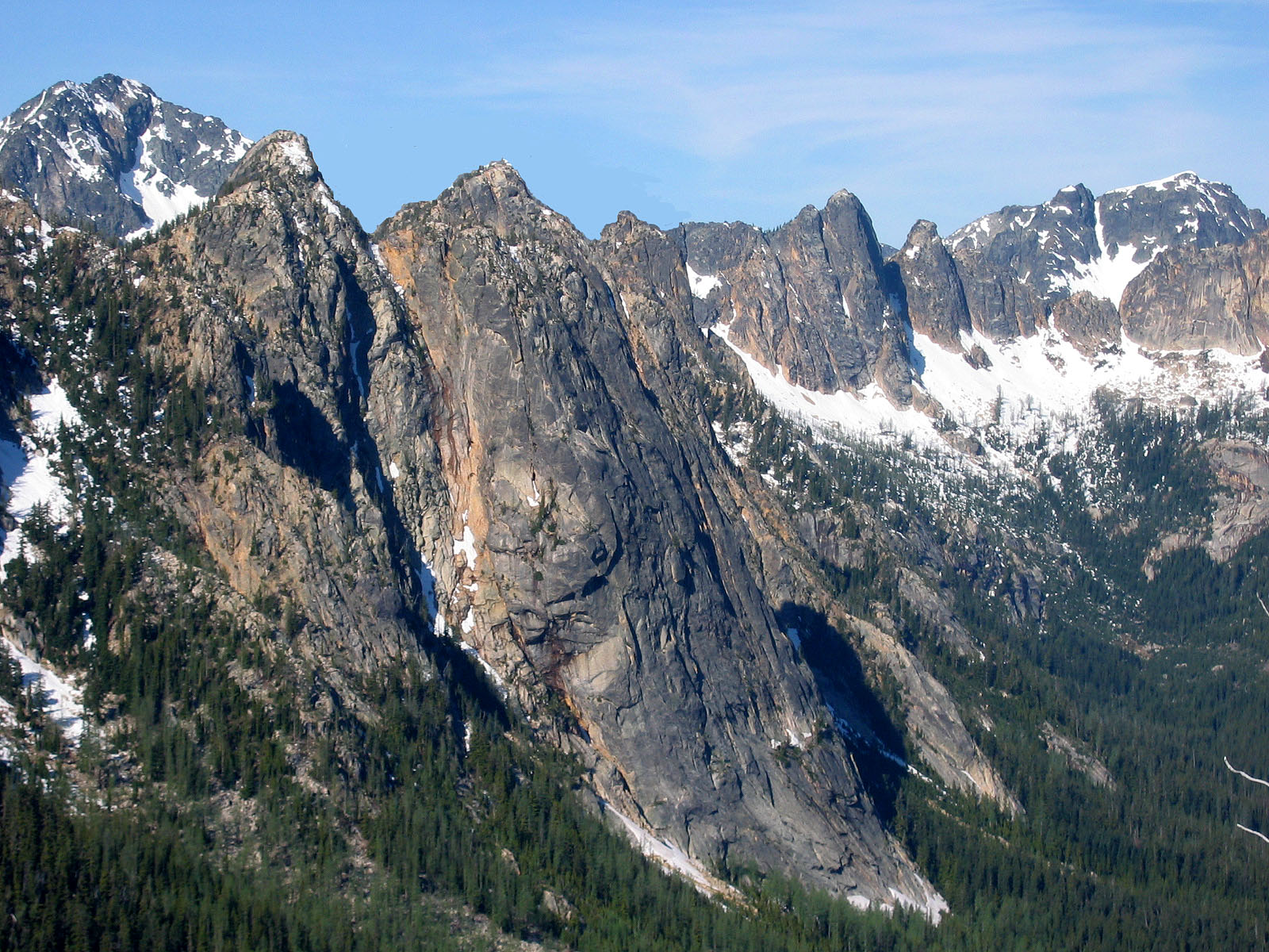 Other thoughts from the top. Classic views of Abernathy, Gilbert, and “Marsupial Mtn” 7917' (N of Gilbert) are enjoyed from Shelokum this time of year. The most striking rock climb visible from our route to Shelokum was a buttress/wall system I'd never heard of, or regarded. I took a shot of it, and was planning on emailing the photo as an unknown, maybe unclimbed mystery to some of my real rock-jock buddies to watch them drool. Here it is.