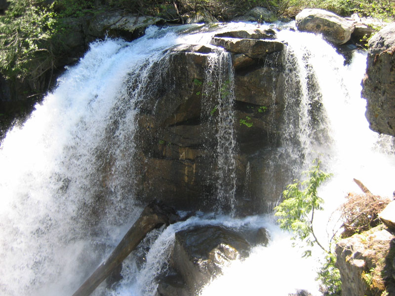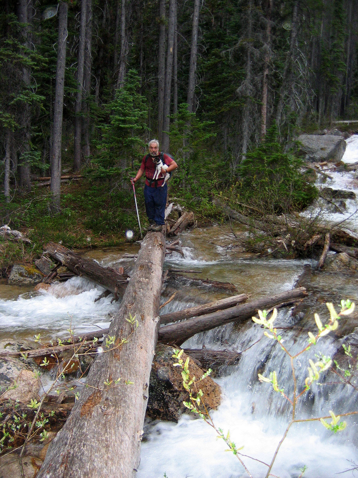 We stopped early and made camp about here, at 4900 feet, near where the Main and South Forks of Cedar Creek join. Sofy, our Roper family's newest addition, a heart-winning little 10-month old, 13-pound terrier had done a great job to this 7-mile point on the trail. This was to be her first “real” mountain test (though she had warmed up on Lobotomy Hill), and little did we know what was to lie ahead. She made the whole trip under her own steam to here, except for one log crossing (below) over the brisk West Fork of Cedar Creek.