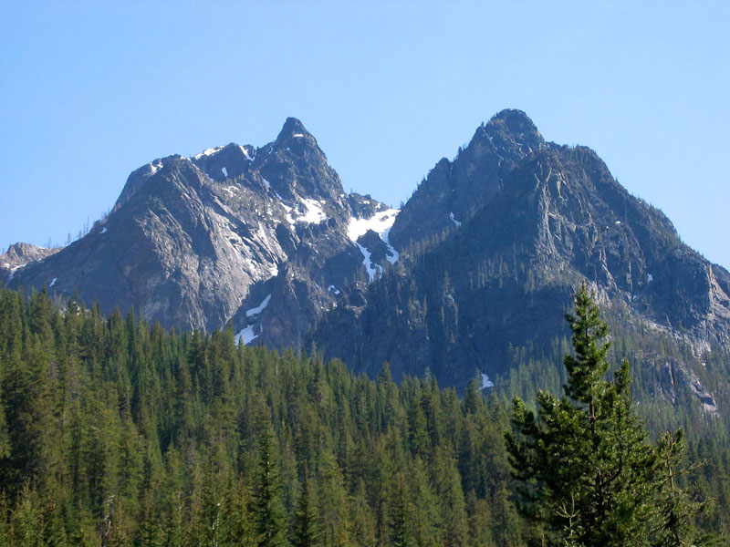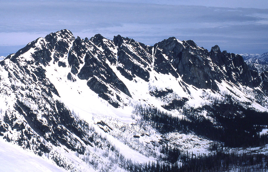 On paper, Shelokum looks to be a daytrip for the young gazelles. Short story: Drive North Cascades HW 20 over Washington Pass, then down Early Winters Creek to the Cedar Creek spur, and up to park at a 3000-foot TH (trailhead). It's about 7 miles and 2000 vertical by the trail to the x-c turnoff, then less than 2 miles and another 3069-foot gain to the top. RT Totals: <18 miles, 5069 feet up and down. Easily said, but not so easily done.