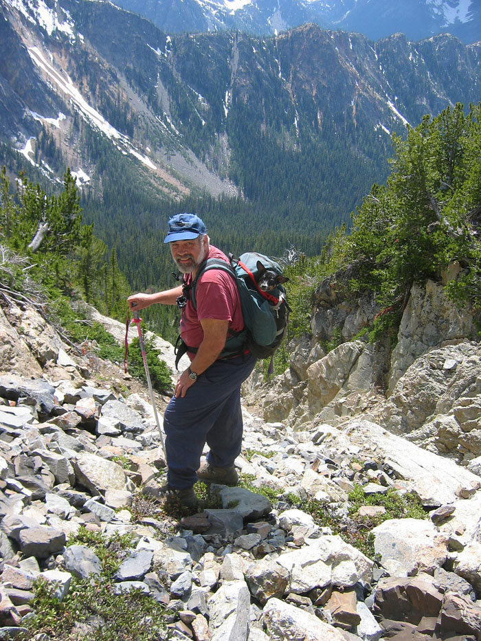 Jim noticed that one of her paws was bleeding a bit, and her belly and bottom were barked up as well from the talus descent. At this point I simply put her in my pack and we continued down another thousand feet vertical, where we turned right into softer ground in the woods where Sofy was able to trot along on her own again.