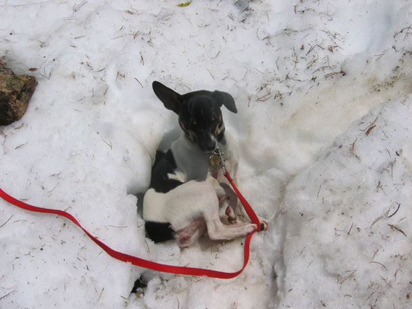 After dropping several hundred feet down a SW gully, avoiding our up route, we stopped at a snowpatch where I kicked out a platform for Sofy to rest and cool off. She chomped at the snow and seemed quite content to just stay there.